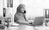 Young Arabic Businesswoman Talking On Cellphone And Using Laptop In Office