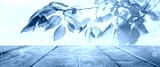 Wooden table and tree branch with green leaves on sunny day. Springtime