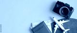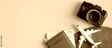 Top view of traveler accessories. Flat lay beach hat, passport, map, airplane, photo camera on yellow background with copy space. Travel summer holiday vacation banner concept