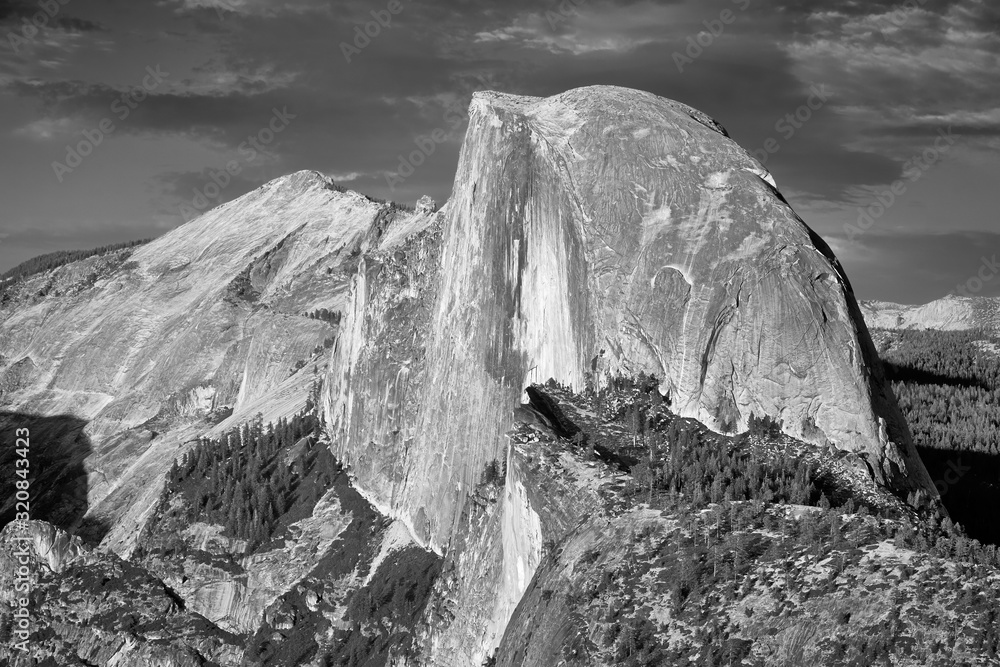 Black and white picture of Half Dome, famous granite dome of Yosemite Valley, California, USA.