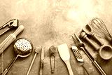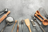 A variety of kitchen utensils and tools on a gray concrete rustic background. Top view, flat lay, copy space.