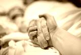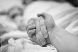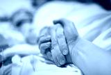 Man holding hand, giving support and comfort to woman, loved one sick in hospital bed.