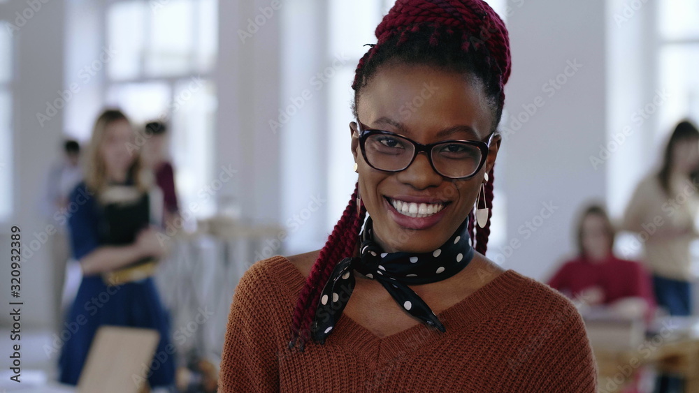 Amazing close-up portrait of young African creative business woman in eyeglasses with white teeth smiling at office.
