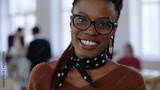 Incredible close-up portrait of young happy African creative business woman in smart eyeglasses smiling at modern office