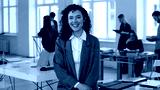 Medium shot portrait of happy positive young Caucasian business woman with curly hair smiling at camera at modern office