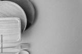 Top view empty wooden renewable bamboo serving plates and platters with cutlery eco friendly natural good for environmental climate change on grey color organic paper background with copy space.