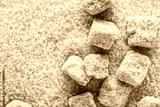 Сane brown sugar. Background from crystals and pieces of sugar. Сlose-up