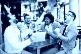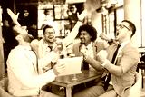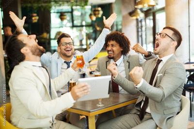 Happy creative business colleagues having a drink after work and using tablet. The beginning of the weekend. Successful working week