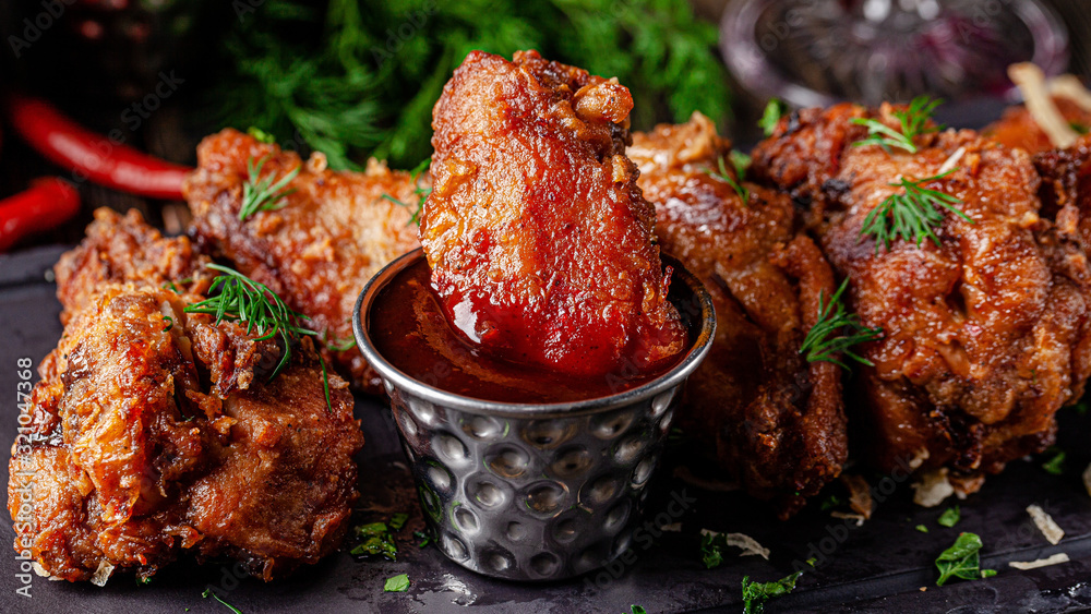 European cuisine in Ukrainian style. chicken legs and wings breaded with barbecue sauce. rustic style photo. background image, copy space text