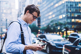 Young employee in shirt and glasses texting on phone smiling outdoors