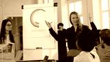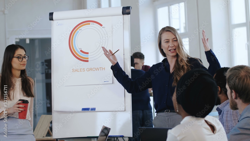 Happy young charismatic coach business woman sharing skills with multiethnic colleagues at modern office seminar.