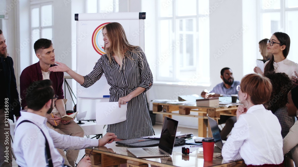 Happy young smiling blonde finance coach woman teaching multiethnic workers, leading team discussion at modern office.