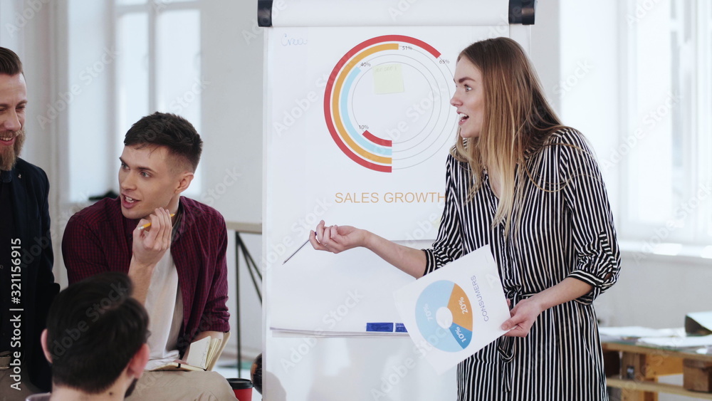Young beautiful blonde business woman coach leading team discussion, presenting project at modern office flipchart.