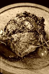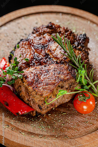 American cuisine. A large grilled pork steak lies on a wooden board with vegetables. background image, copy space text