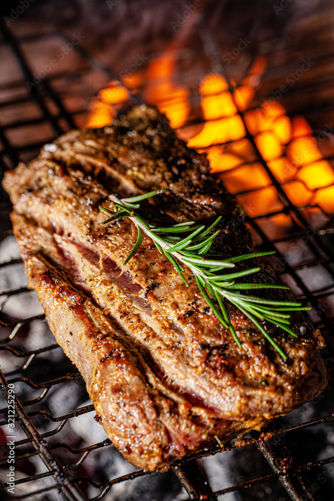 American cuisine. The process of hot smoking boiled pork on the grill. The meat is on fire. background image, copy space text
