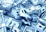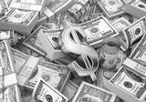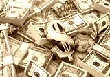 Money. Mixed wads of USD banknotes and gold dollar sign.