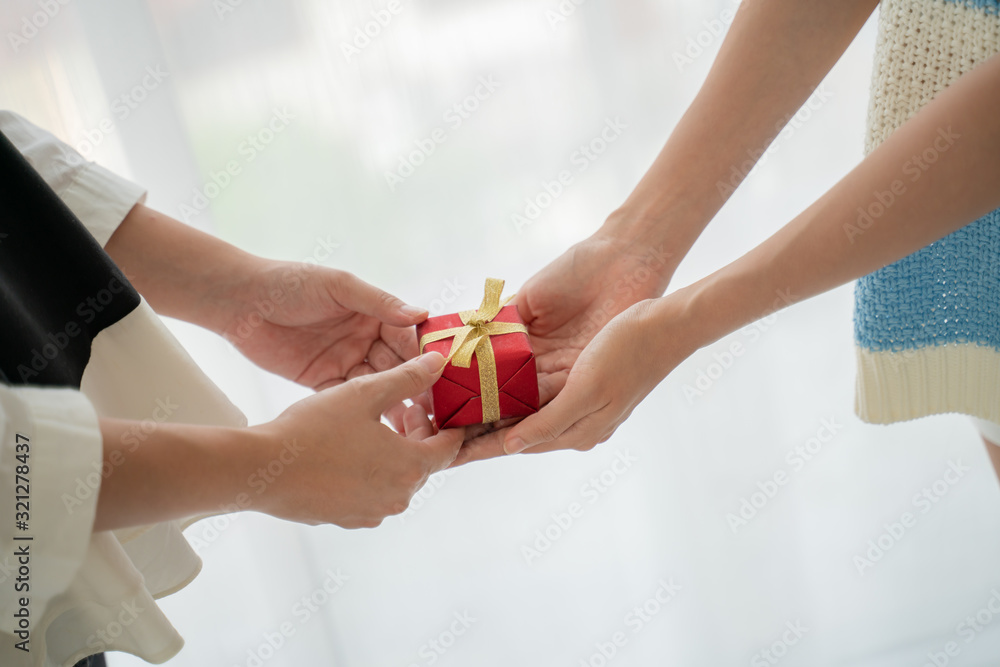 Concept of LGBT sexuality with happy together.Close Up of hand lesbian give a Beautiful Shiny Gift Box.Surprise Partner is Extremely Happy.