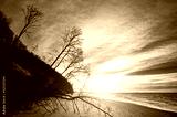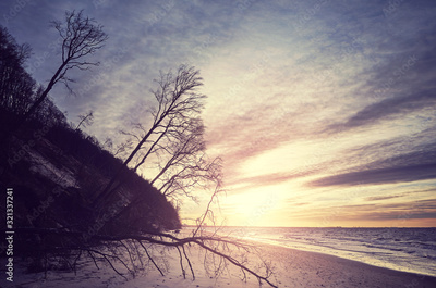 Beach with trees silhouettes in Wolin National Park at sunset, color toning applied, Poland.