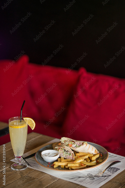 a tortilla filled with vegetables and chicken served with french fries