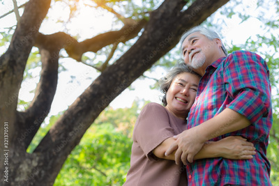 Portrait happiness senior asian couple. Grandfather and grandmother embracing each other with love and smiley faces under tree. Elderly man and old woman have good health and enjoy life with sunlight
