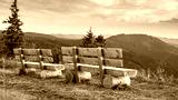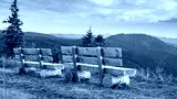 Benches on the Feldberg with a view over hazy hills.