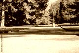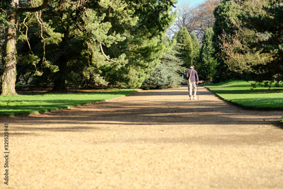 Distant view of a senior adult seen walking alone in a large botanical gardens in late winter. Large pine trees following the path.