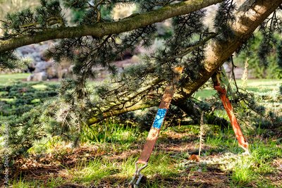 Part of a large pine tree branch seen strapped to the ground within a botanical gardens. The heavy duty strap is under tension with the aim of keeping the large branch shapped.