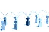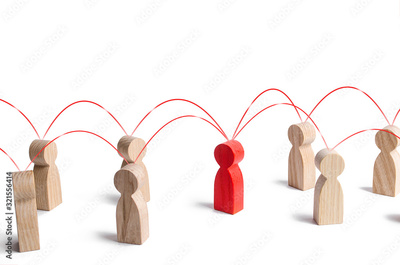 Red human figure in contact with surrounding persons. Cooperation collaboration, teamwork. Role intermediary mediator, leader, leadership. Communication, networking. Key expert specialist professional