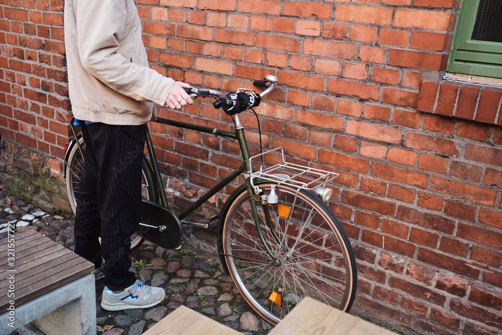 Close up man parking his bicycle near brick wall outdoor