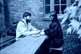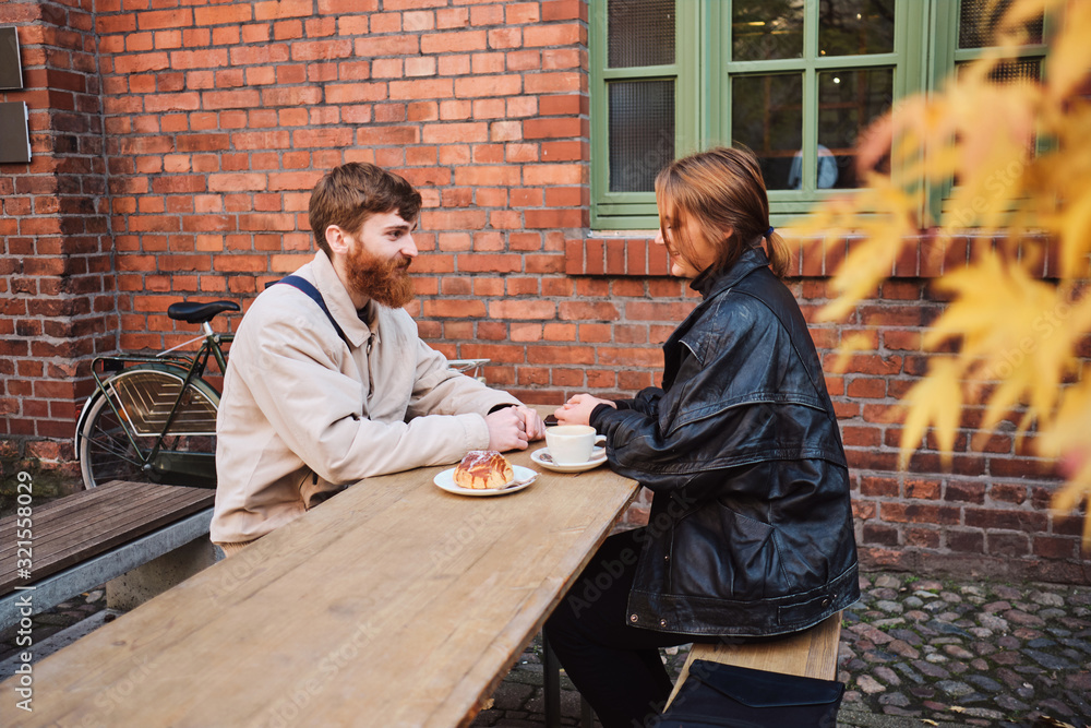 Young beautiful couple happily resting together drinking coffee in street cafe