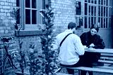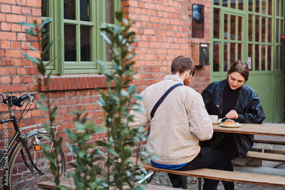 Young attractive couple resting together in street cafe