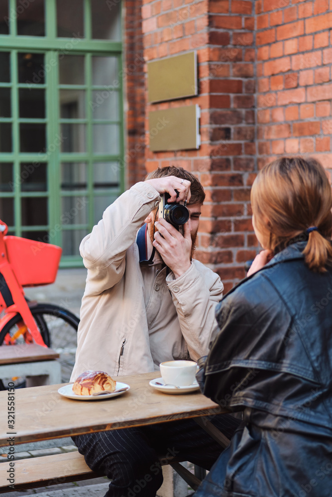 Young man taking photo of girlfriend during coffee break in street cafe