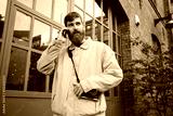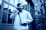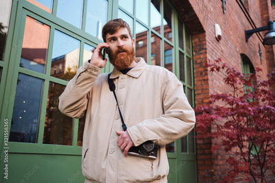 Young casual bearded man intently looking away while talking on cellphone outdoor