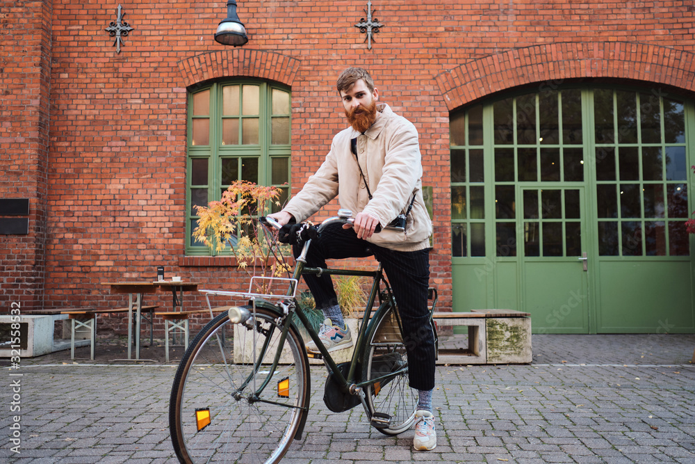 Young attractive bearded man thoughtfully looking in camera with old classic bicycle on city street