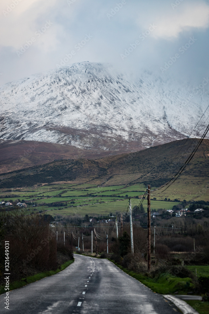 Roadway through snow capped mountians and rolling grass hills on the Dingle peninsula in the Republic of Ireland