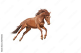 Beautiful red horse galloping in a phase jump developing mane. Thoroughbred stallion isolated on white background