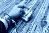 A man's hand in handcuffs and US dollars banknotes on wooden table. Corruption or economic crime concept.