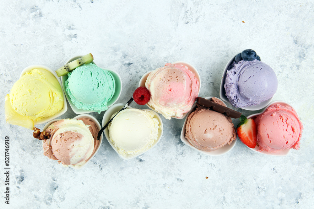 Various of ice cream flavor whit fresh blueberry, strawberry, kiwi, lemon, vanilla setup on rustic background . Summer and Sweet cold ice cream