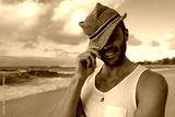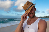 Young caucasian male standing on Sunset Beach in Hawaii wearing a straw hat with the ocean in the background