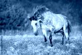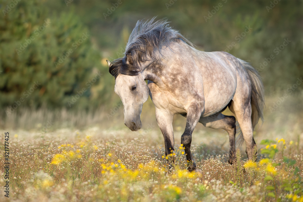 White arabian stallion with long mane run gallop on meadow