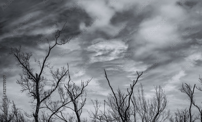 Silhouette dead tree and branch on grey sky background. Black branches of tree. Nature texture background. Art background for sad, dead, lonely, hopeless, and despair. Halloween day background.