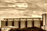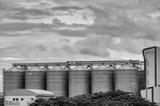 Agricultural silo at feed mill factory. Big tank for store grain in feed manufacturing. Seed stock tower for animal feed production. Commercial feed for livestock, swine and fish industries.