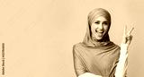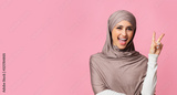 Positive arabic girl in hijab showing v-sign, demonstrating peace gesture