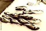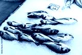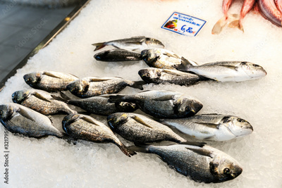 freshly caught sea fish or oysters or prawns on ice on a store sail