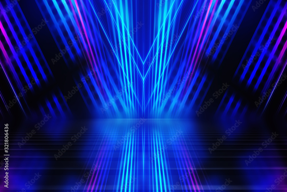 Abstract dark background of empty scene with ultraviolet light. Neon light figures in the center of the stage.
