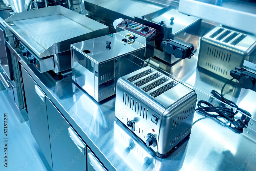Hot shop in a restaurant. Workshop for the hot processing of dishes. Toaster for catering. Deep fryer. Electric frying pan. Concept - the organization of food production. Furniture for restaurants