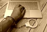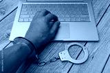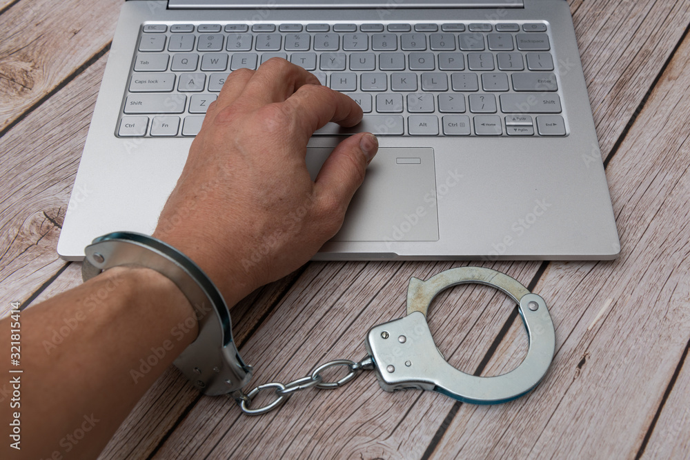 A man's hands in handcuffs and laptop on wooden table. Piracy, internet hacking and punishment for cybercrime concept.