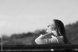 Woman sitting on a bench breathing fresh air in the mountain