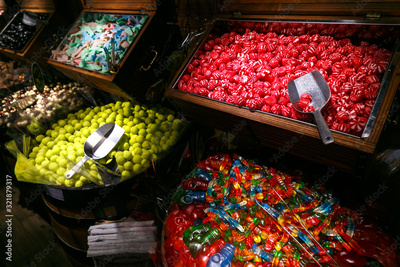 different candies, candies, sweets in a shop window in Venice. Textures and backgrounds with colorful bonbons