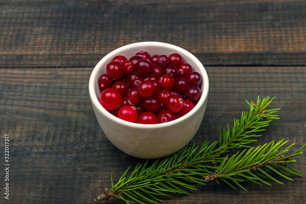 Ripe fresh cranberries in a bowl with pine branch on rustic wooden background. Winter healthy eating. Organic and vegetarian food contain vitamin c. Close up, copy space for text